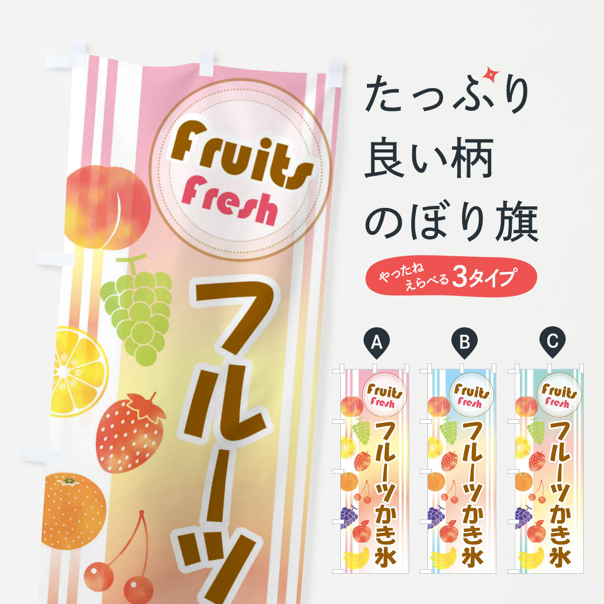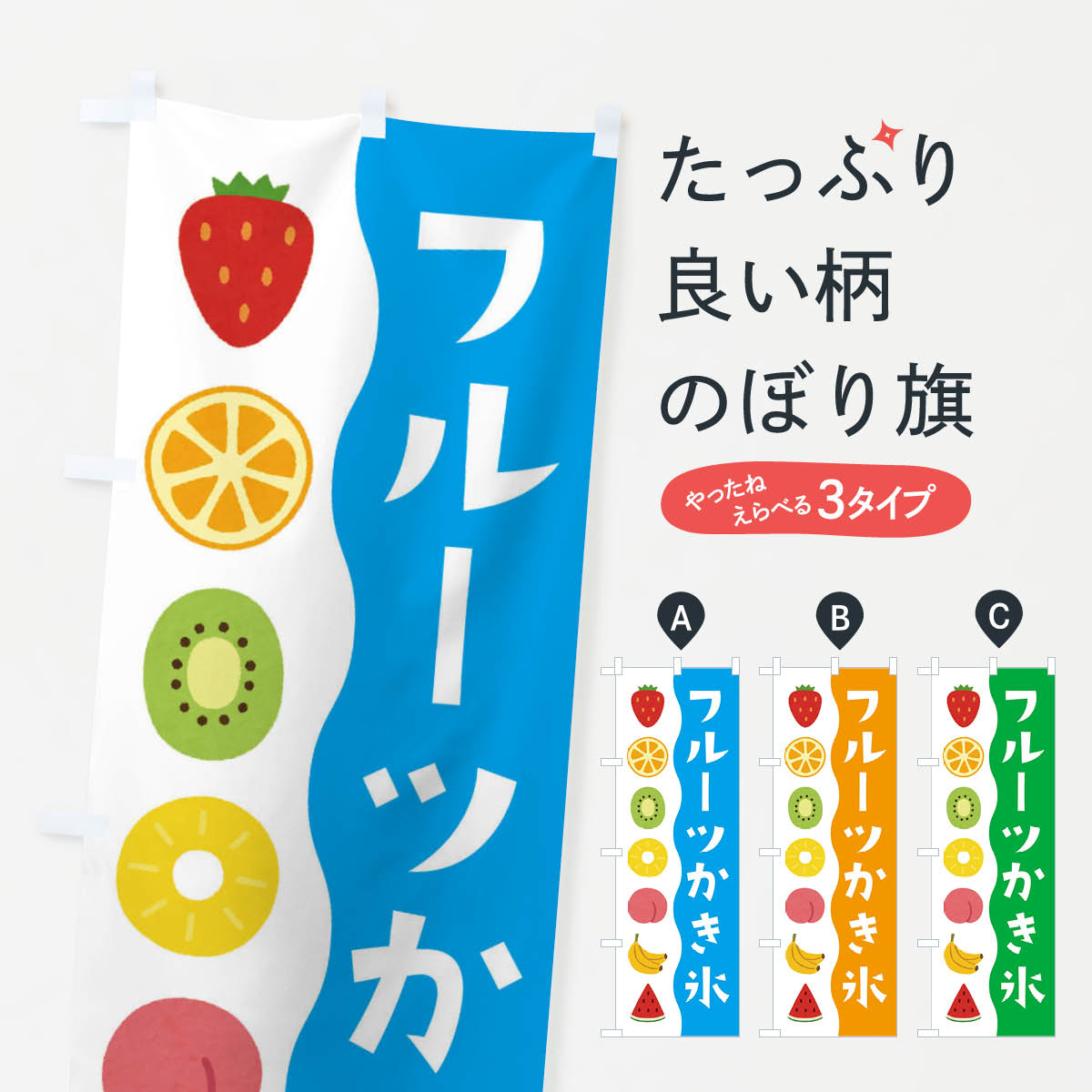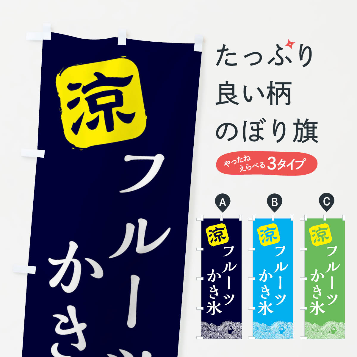 グッズプロののぼり旗は「節約じょうずのぼり」から「セレブのぼり」まで細かく調整できちゃいます。のぼり旗にひと味加えて特別仕様に一部を変えたい店名、社名を入れたいもっと大きくしたい丈夫にしたい長持ちさせたい防炎加工両面別柄にしたい飾り方も選べます壁に吊るしたい全面柄で目立ちたい紐で吊りたいピンと張りたいチチ色を変えたいちょっとおしゃれに看板のようにしたいかき氷のぼり旗、他にもあります。【ポスト便 送料360】 のぼり旗 フルーツかき氷・フフルーツカキ氷・ピンスのぼり Y8N5 グッズプロ 【名入れできます】内容・記載の文字フルーツかき氷・フフルーツカキ氷・ピンス印刷自社生産 フルカラーダイレクト印刷またはシルク印刷デザイン【A】【B】【C】からお選びください。※モニターの発色によって実際のものと色が異なる場合があります。名入れ、デザイン変更(セミオーダー)などのデザイン変更が気楽にできます。以下から別途お求めください。サイズサイズの詳細については上の説明画像を御覧ください。ジャンボにしたいのぼり重量約80g素材のぼり生地:ポンジ(テトロンポンジ)一般的なのぼり旗の生地通常の薄いのぼり生地より裏抜けが減りますがとてもファンが多い良い生地です。おすすめA1ポスター:光沢紙(コート紙)チチチチとはのぼり旗にポールを通す輪っかのことです。のぼり旗が裏返ってしまうことが多い場合は右チチを試してみてください。季節により風向きが変わる場合もあります。チチの色変え※吊り下げ旗をご希望の場合はチチ無しを選択してください対応のぼりポール一般的なポールで使用できます。ポールサイズ例:最大全長3m、直径2.2cmまたは2.5cm※ポールは別売りです ポール3mのぼり包装1枚ずつ個別包装 PE袋(ポリエチレン)包装時サイズ:約20x25cm横幕に変更横幕の画像確認をご希望の場合は、決済時の備考欄に デザイン確認希望 とお書き下さい。※横幕をご希望でチチの選択がない場合は上のみのチチとなります。ご注意下さい。のぼり補強縫製見た目の美しい四辺ヒートカット仕様。ハトメ加工をご希望の場合はこちらから別途必要枚数分お求め下さい。三辺補強縫製 四辺補強縫製 棒袋縫い加工のぼり防炎加工特殊な加工のため制作にプラス2日ほどいただきます。防炎にしたい・商標権により保護されている単語ののぼり旗は、使用者が該当の商標の使用を認められている場合に限り設置できます。・設置により誤解が生じる可能性のある場合は使用できません。(使用不可な例 : AEDがないのにAEDのぼりを設置)・裏からもくっきり見せるため、風にはためくために開発された、とても薄い生地で出来ています。・屋外の使用は色あせや裁断面のほつれなどの寿命は3ヶ月・・6ヶ月です。※使用状況により異なり、屋内なら何年も持ったりします。・雨風が強い日に表に出すと寿命が縮まります。・濡れても大丈夫ですが、中途半端に濡れた状態でしまうと濡れた場所と乾いている場所に色ムラが出来る場合があります。・濡れた状態で壁などに長時間触れていると色移りをすることがあります。・通行人の目がなれる頃(3ヶ月程度)で違う色やデザインに替えるなどのローテーションをすると効果的です。・特別な事情がない限り夜間は店内にしまうなどの対応が望ましいです。・洗濯やアイロン可能ですが、扱い方により寿命に影響が出る場合があります。※オススメはしません自己責任でお願いいたします。色落ち、色移りにご注意ください。商品コード : Y8N5問い合わせ時にグッズプロ楽天市場店であることと、商品コードをお伝え頂きますとスムーズです。改造・加工など、決済備考欄で商品を指定する場合は上の商品コードをお書きください。ABC【ポスト便 送料360】 のぼり旗 フルーツかき氷・フフルーツカキ氷・ピンスのぼり Y8N5 グッズプロ 【名入れできます】 安心ののぼり旗ブランド 「グッズプロ」が制作する、おしゃれですばらしい発色ののぼり旗。デザインを3色展開することで、カラフルに揃えたり、2色を交互にポンポンと並べて楽しさを演出できます。文字を変えたり、名入れをしたりすることで、既製品とは一味違う特別なのぼり旗にできます。 裏面の発色にもこだわった美しいのぼり旗です。のぼり旗にとって裏抜け(裏側に印刷内容が透ける)はとても重要なポイント。通常のぼり旗は表面のみの印刷のため、風で向きが変わったときや、お客様との位置関係によっては裏面になってしまう場合があります。そこで、当店ののぼり旗は表裏の見え方に差が出ないように裏抜けにこだわりました。裏抜けの美しいのグッズプロののぼり旗は裏面になってもデザインが透けて文字や写真がバッチリ見えます。裏抜けが悪いと裏面が白っぽく、色あせて見えてしまいズボラな印象に。また視認性が悪く文字が読み取りにくいなどマイナスイメージに繋がります。いろんなところで使ってほしいから、追加料金は必要ありません。裏抜けの美しいグ