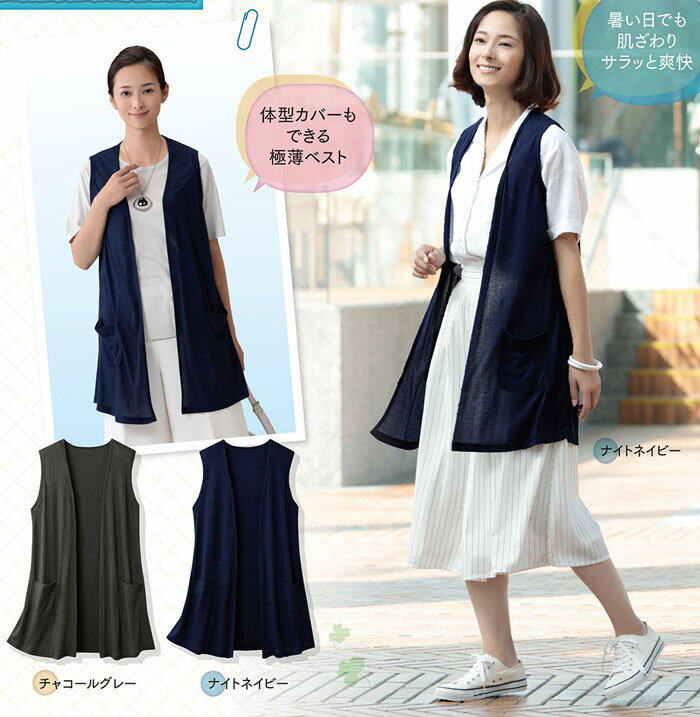 --------------------------------------------------------- 商品の説明 ・薄手でやわらか、肌触りが良く、シワになりにくい生地を使用。 ・コンパクトに折りたためるので持ち運びにとっても便利です。 ・ヒップまでの隠れる丈で気になる体型をカバー。 ・裾に向かって広がっているAラインで着やせ効果でスッキリ。 ・左右にポケット付。 ・身丈約80cmのロング丈。 商品の仕様 ●材質/ポリエステル80%・レーヨン20% ●サイズ / M〜L(バスト79〜94cm 身長154〜162cm)、 LL〜3L(バスト93〜108cm 身長154〜162cm)、身丈:80cm ●内容量/1枚 ●原産国/中国 ●メーカー/セルヴァン ●洗濯方法/ 洗濯ネットを使用してください。アイロンは当て布をしてください。弱く絞る、もしくは短時間脱水してください。濃色の物は、淡色や白物と一緒に洗わないでください。着用時に強い摩擦を受けたり、水や汗等で湿った状態で他の物とこすり合わせると色が移る恐れがあります。万一色移りした場合は早めに洗濯してください。摩擦で毛玉ができやすいので、激しい運動や長期の連用はお避けください。蛍光増白剤入り洗剤のご使用はお避けください。 ※ナイトネイビーは完売いたしました。 --------------------------------------------------------- [検索用]( ロングベスト レディース 春夏 婦人 トップス ベスト 羽織り ポケット付 涼感 ロング丈 体型カバー Aライン )
