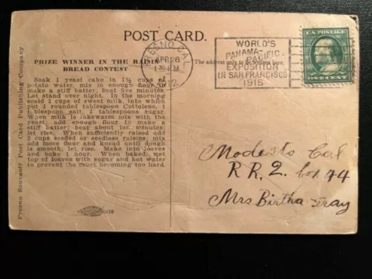 1912年 アメリカ合衆国 ポストカード 表紙 フレズノからモデスト CA カリフォルニア レーズンデー