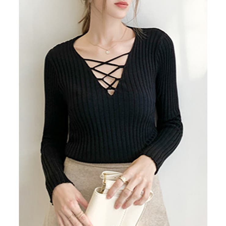 【ポイント5倍!本日限定!お買い物マラソン!1着半額!まとめ買い2枚購入割引クーポン利用で! 】ニットトップス フロントレースアップ秋服【ゆうパケット可】