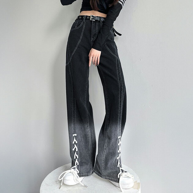 配色 ステッチ フロント レースアップ ハイウエスト デニムパンツ ボトム レディース オールシーズン ジーンズ ジーパン ハイライズ スタイルアップ 脚長効果 ゆったり ルーズ リラックス おしゃれ デイリー カジュアル ストリート 韓国コーデ