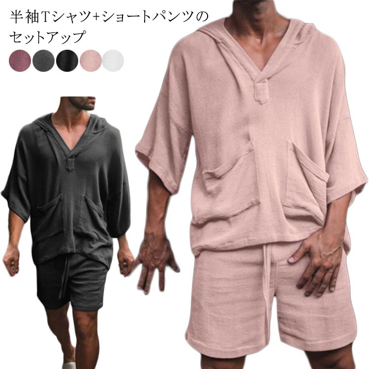 綿麻 セットアップ 薄手 膝上 上下セット メンズ 無地 メンズ上下セット フード付き 綿 麻 ポケット付き カジュアル ゆったり ショートパンツ 短パン 半ズボン Tシャツ ナチュラル リラックス 大きいサイズ 夏服 夏物 半袖 部屋着 大人 男性