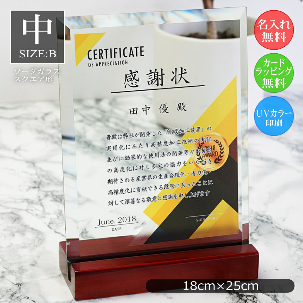 ガラス 表彰盾 表彰状 (中) 感謝状 名入れ 記念品 社内表彰 認定証 イベント 大会 優勝 コンクール 発表会 卒業記念 卒業証書 昇進祝い 退職祝い 周年記念 創立記念 開店祝 新築祝い 表彰楯 盾 ギフト プレゼント 披露宴 ウェディング ブライダル 挙式 dsp-2-b