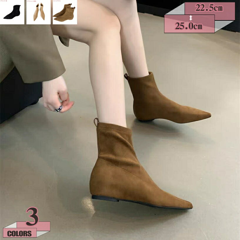 500円OFFクーポン ストレッチブーツ ショートブーツ レディース ソックスブーツ スリッポン スウェード 太ヒール フラット ポインテッドトゥ ブーティ ブーティー ブラウン スウェード 走れる 歩きやすい 疲れにくい 美脚 サイドゴア gratiahome