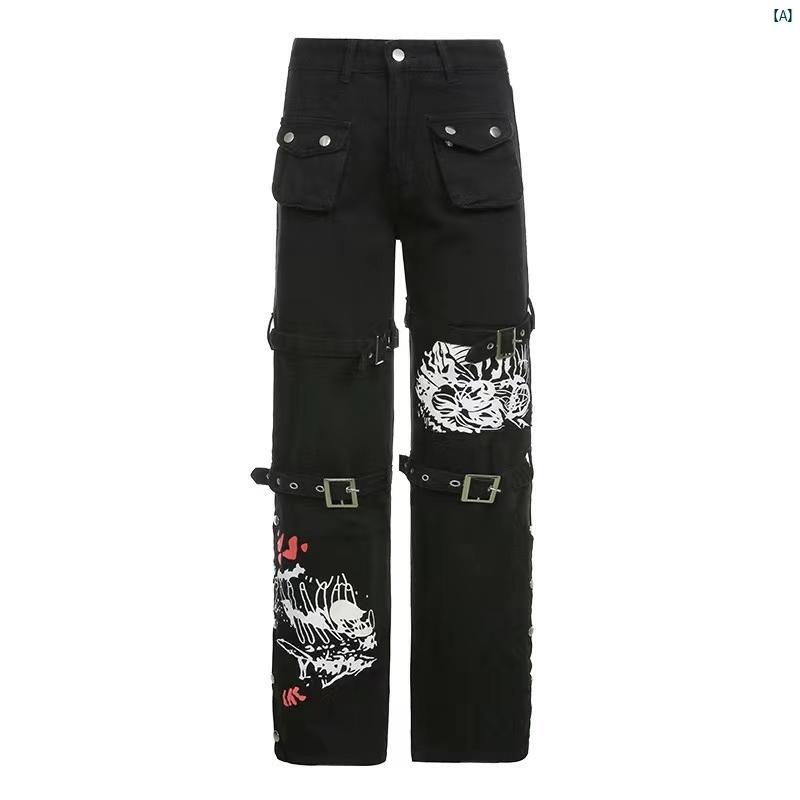 レディース Y2K ファッション 2000代 ダーク パンク メタル バックル クロス サブカルチャー ブラック ウォッシュ デニム メンズレディース パンツ