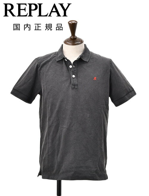 リプレイ REPLAY 半袖ポロシャツ メンズ 3つ釦 鹿の子地 コットンピケ ブラックウォッシュ 製品染め ブランドロゴ刺繍 レギュラーフィット 国内正規品 オクテット