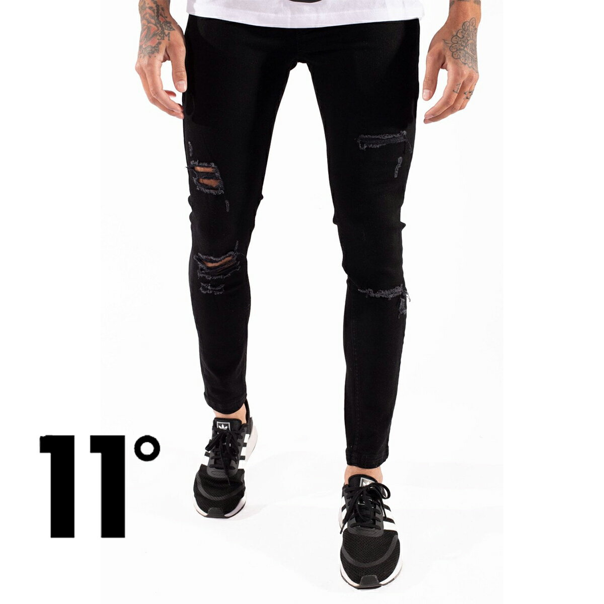 イレブンディグリーズ 11Degrees ダメージジーンズ Sustainable Distressed Jeans Skinny Fit ジェットブラックウォッシュ ストレッチ デニム パンツ メンズ[衣類]