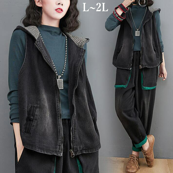 ベスト デニム アウター ジャケット フード付き コート ブラックウォッシュ レディース ノースリーブ ゆったり 大きいサイズ オーバーサイズ 春 秋 L 2L