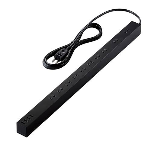 電源タップ USBタップ ホコリ防止シャッター付 固定可能 10口 合計24W USB-Aメス4ポート ブラック■10個の差込口と4個のUSB-Aポートを備えた細身のUSBタップです。■USBポートの合計最大出力は24W(5V/4.8A)でACアダプターを利用することなく、対応するスマートフォンやタブレットを複数同時に充電できます。■USBポートには接続された機器を自動検知し、最適な出力で充電できる「おまかせ充電」機能を搭載しています。■AC差込口には、未使用時にホコリの侵入を防止する「ホコリ防止シャッター」を装備しています。■AC差込口には、万一の発熱の際にも融解しにくく、電気火災の防止に有効な耐熱性に優れた熱硬化性樹脂を使用しています。■一部のAC差込口の間隔距離を通常より離した57mmとすることで、大きなACアダプターなどを利用する際も隣のAC差込口に干渉しにくい設計となっています。■誘導雷による最大12500Vまでの雷サージを吸収する素子(バリスタ)を搭載し、接続機器を保護します。(※最大サージ電圧12500VはJEC210/212規格に基づく数値です。受けた電圧や回数により性能は劣化します。)■脚パーツを展開することで重いACアダプターなどを接続した際もタップが横転しにくくなります。■脚パーツには直径10mmの吊り穴と直径5mmのネジ固定穴、底面には十字型のダルマ穴を備えており、付属のタッピングネジで壁などに吊ったり、固定して利用できます。■(一社)日本配線システム工業会規格(JWDS0010)に適合した二重被覆コードを採用。断線や被覆破れによる感電や火災の防止に有効です。■2ピン式コンセントプラグのピン根本に絶縁スリーブを装備しており、トラッキング現象による火災の防止に有効です。■狭い場所でも設置しやすい180度スイング可能なコンセントプラグを採用しています。■※USBを利用する際に必要な各種ケーブルは同梱しておりません。別途ご用意ください。■※家屋や家具などに本製品をネジ留めする場合は、電気工事士による施工が必要です。■自社環境認定基準を1つ以上満たし、『THINK ECOLOGY』マークを表示した製品です。■環境保全に取り組み、製品の包装容器におけるプラスチック重量を、社内基準製品より20%以上削減した製品です。■環境保全に取り組み、製品の包装容器が紙・ダンボール・ポリ袋のみで構成されている製品です。■※電源プラグを間違ってUSBポートに差し込まないよう十分ご注意ください。ポートの変形や短絡により発熱や発火の原因になる可能性があります。■差込口仕様 : Aタイプ 2ピン■差込口個数 : 10個口■差込口間隔 : 36mm(片端の2箇所のみ57mm)■プラグ仕様 : Aタイプ 2ピン■ACコード長 : 約2.5m■USB端子形状 : USB-Aポート×4■AC側定格 : 14A 125V 1400Wまで■USB側定格入力 : AC100-240V 50/60Hz■USB側定格出力 : 合計最大24W(5V/4.8A) (1ポート最大12W(5V/2.4A))■スイッチ : ×■雷ガード : ○■ほこりシャッター : ○(AC差込口のみ)■抜け止め機能 : ×■通電表示ランプ : ×■二重構造 : ○■二重被ふく : ○■絶縁キャッププラグ : ○■スイングプラグ : ○■マグネット : ×■吊り穴 : ○■ネジ固定穴 : ○■ブレーカー : ×■カラー : ブラック■材質 : 本体 : ポリカーボネート樹脂 差込口 : ユリア樹脂 プラグ : PVC樹脂■外形寸法 : 幅545mm×奥行34mm×高さ34mm ※本体のみ(突起部を除く)■質量 : 約600g■付属品 : 固定用ねじ×3(予備1本含む) 取扱説明書■使用可能地域 : 日本国内専用■法規 : ◇PSE 特定電気用品■保証期間 : 1年間天然石3個おまけつき(商品とは関係ありません)別送