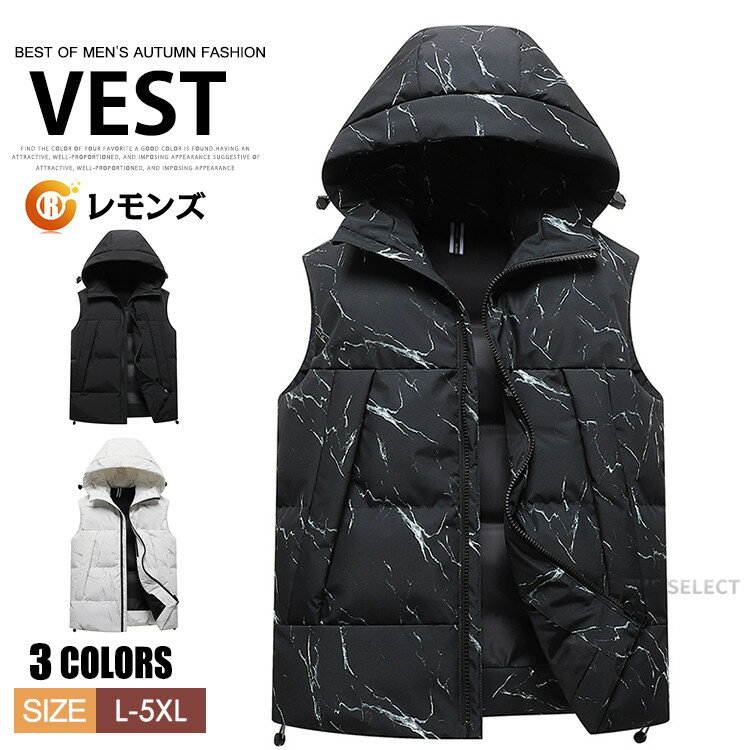 中綿ベスト メンズ ダウンベスト メンズベスト ゴルフウェア アウター 中綿ブルゾン ジップアップ カジュアル ベスト フード付き ジャンパー チョッキ 軽量 秋服 冬服 秋冬 防寒着 メンズファッション 作業着 キャンプ アウトドア ホワイト ブラック