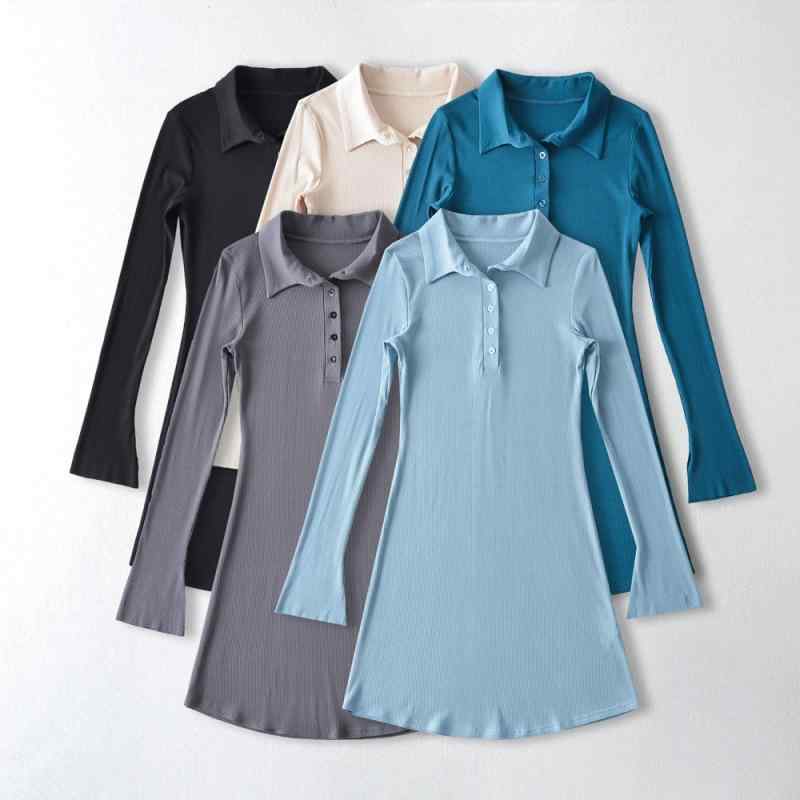 ワンピース レディース 春夏 ミニ 膝上 タイト 長袖 翻領 コットン ポリエステル 無地 ブラック ベージュ ブルー グレー カジュアル ストリート セクシー