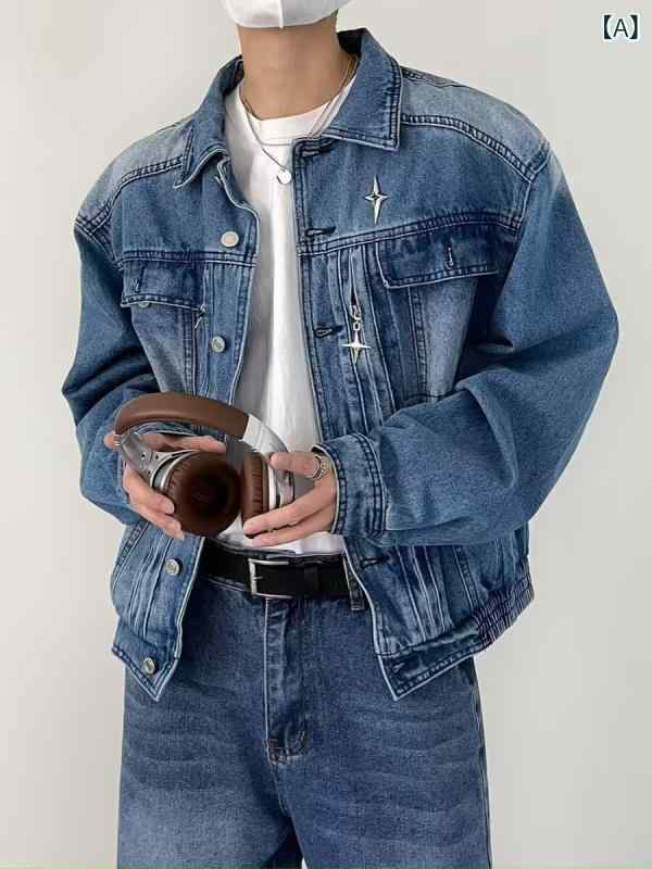 ジャケット メンズ デニム ショート丈 ウォッシュ加工 ヴィンテージ レトロ 韓国風 ルーズフィット オーバーサイズ 襟付き 春秋 メタルアクセントショルダー ブルー グレー カジュアル ストリートファッション