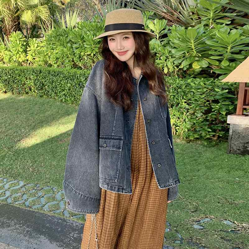 ・カテゴリ: アウター・スタイル: ストリートカジュアル、デニム調・主な素材: ポリエステル繊維 70〜80%・ネックライン: ポロ襟・袖丈: 長袖・袖タイプ: レギュラー・フィット: ルーズフィット・着丈: 標準丈・生地の厚さ: 中厚・フロント: シングルボタン・カラー展開: ブルーグレー・サイズ展開: S、M、L、XL・対象: 大人・性別: 女性