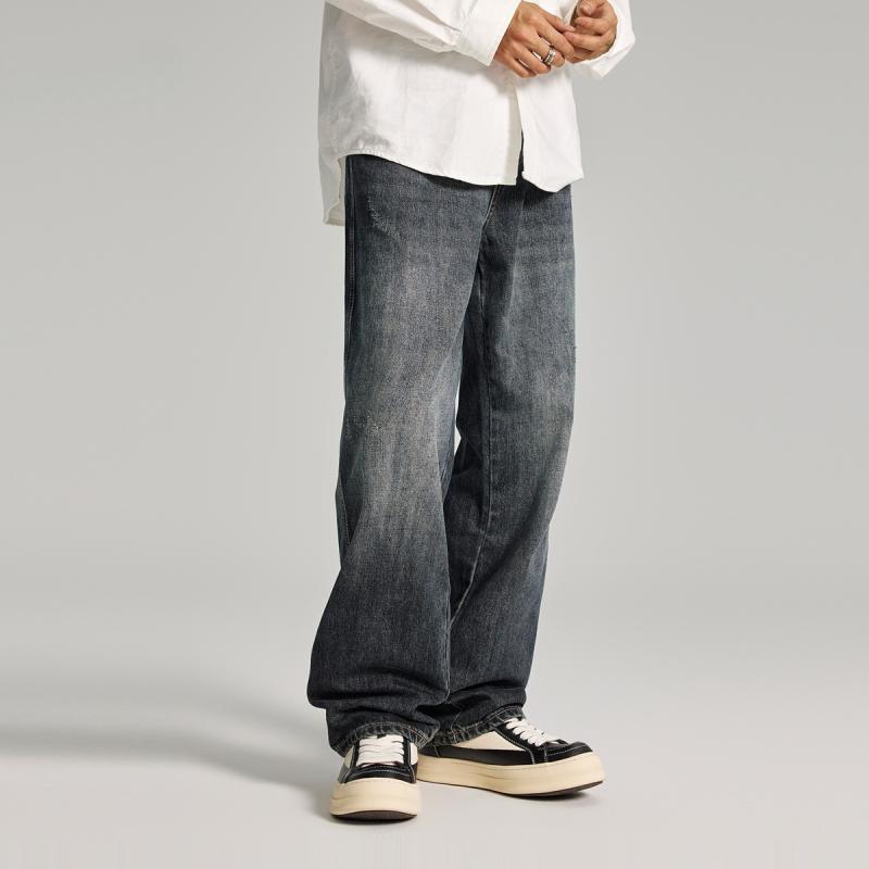 デニムパンツ メンズ オーバーサイズ ゆったり ワイドストレート アメカジ レトロ ウォッシュ加工 綿混 ロング丈 春物 ブルーグレー カジュアル ストリートファッション