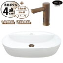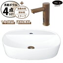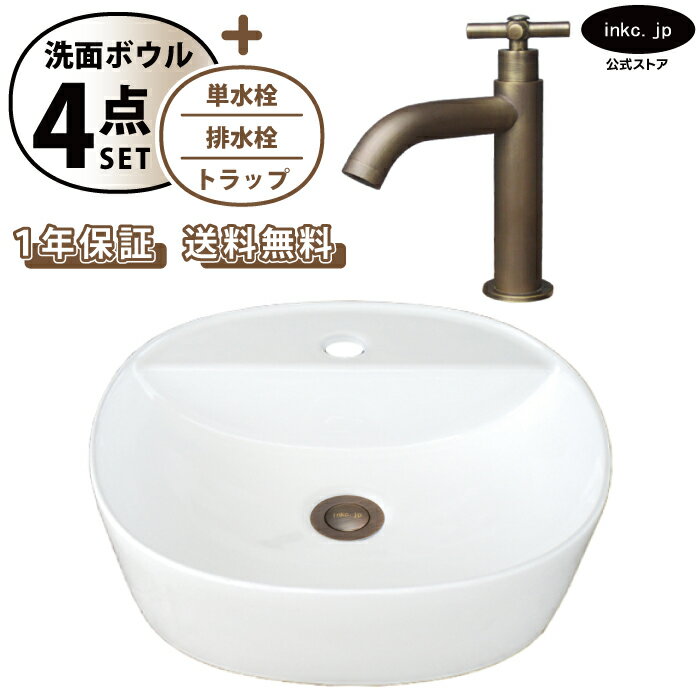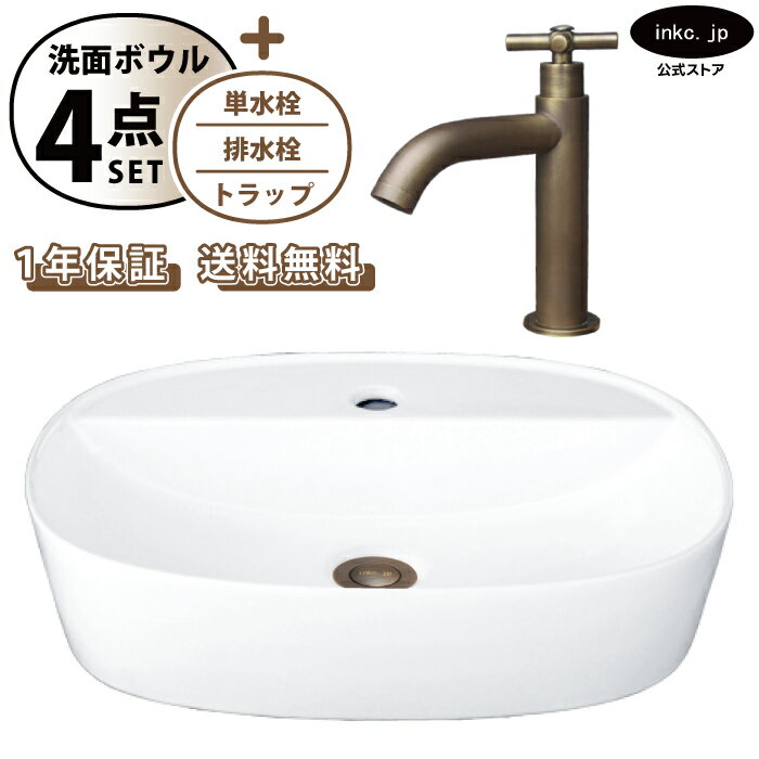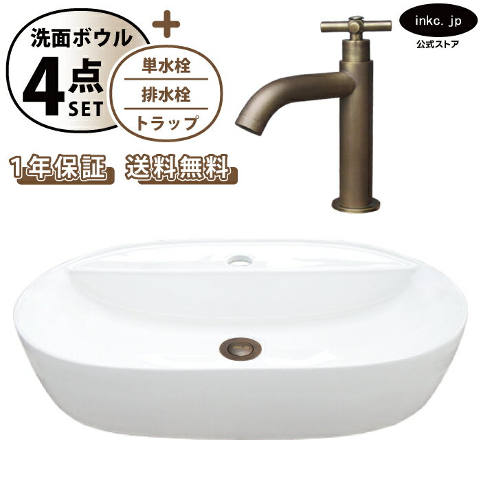 洗面ボウル おしゃれ 白 ホワイト 置き型+単水栓+排水栓+トラップ セット 手洗い器 楕円 丸 大きい 大きめ 洗面台 陶器 オーバーフロー無し クロス ハンドル 古銅 ブロンズ シンプル お家 店舗 造作 diy リフォーム サイズ 幅 600 奥行き 400 INK-0401046H-0302071Hset