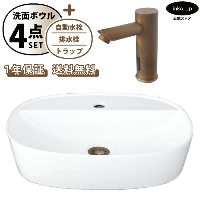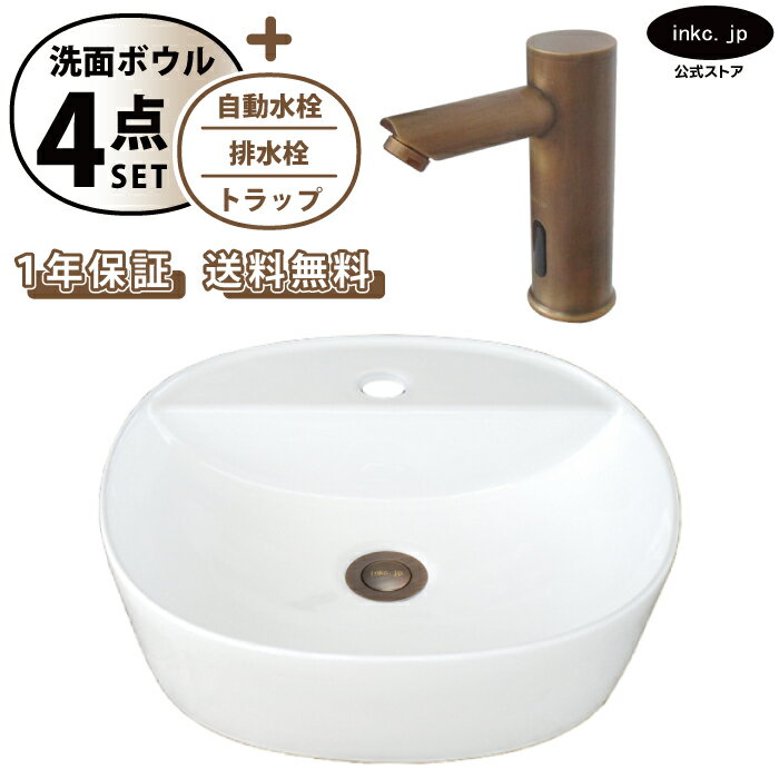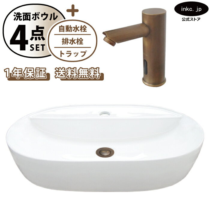 洗面ボウル おしゃれ 白 ホワイト 置き型+自動水栓+排水栓+トラップ セット 手洗い器 楕円 丸 大きい 大きめ 洗面台 陶器 オーバーフロー無し タッチレス 古銅 ブロンズ シンプル お家 店舗 diy リフォーム 造作 サイズ 幅 600 奥行き 400 INK-0401046H-0305015Hset