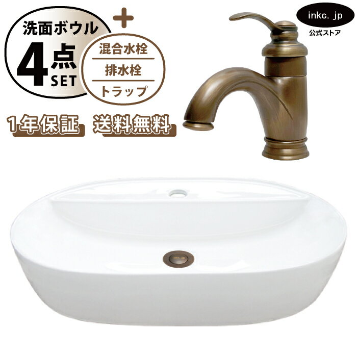 洗面ボウル おしゃれ 白 ホワイト 置き型+混合水栓+排水栓+トラップ セット 手洗い器 楕円 丸 大きい 大きめ 洗面台 陶器 オーバーフロー無し シングルレバー ハンドル 古銅 ブロンズ シンプル お家 店舗 diy リフォーム サイズ 幅 600 奥行き 400 INK-0401046H-0303112Hset
