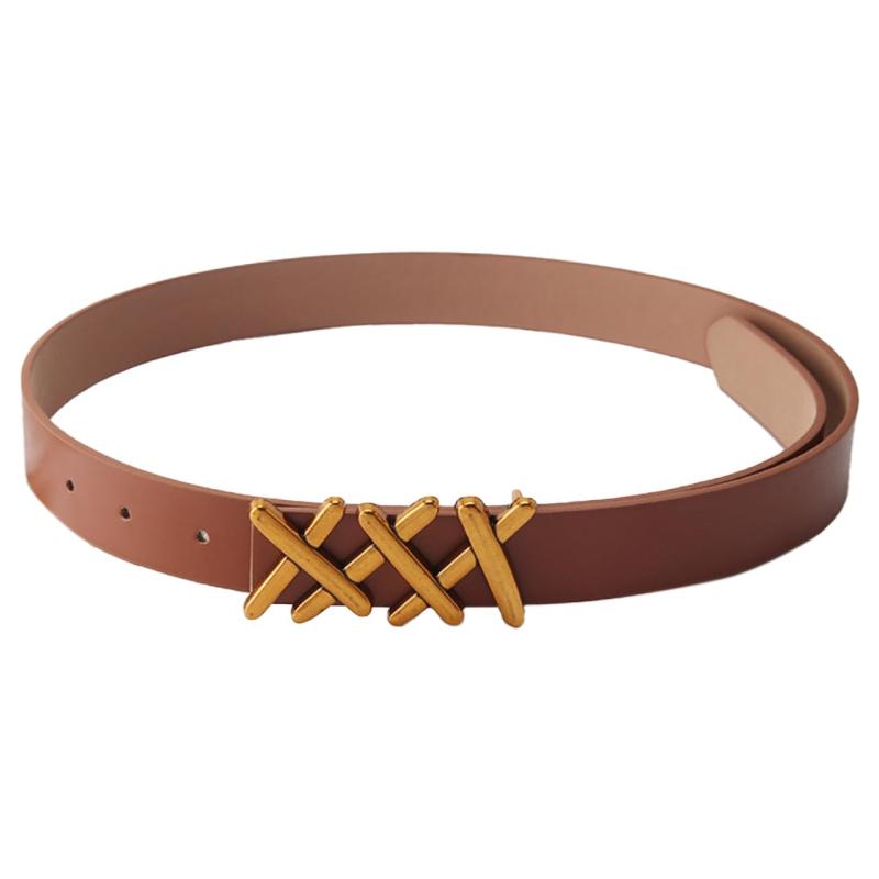 [ホワイトファング] ベルト ピンベルト クロス ブロンズ シンプル 大人 おしゃれ 合皮 レザー レディース BT575交互に交わるクロスデザインの ブロンズ バックル が おしゃれ な ピンベルト式 レディース デザイン レザー ベルト。シンプルかつ少しレトロな デザイン が パンツスタイルをはじめ、カジュアルな服装やレトロスタイルにも使え、汎用性抜群ウエストラインを強調することができ、スタイルアップが期待できます。引き締め効果もあり、シルエットを整えられます。ブラック、ブラウン、キャメルの全3色展開で、その日のスタイルやシーンに合わせてご使用いただけます。カラー:全3色 サイズ:長さ 約105cm以下 幅 約3cm