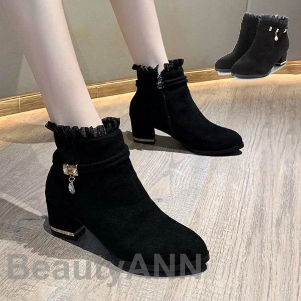 太ヒール ショート スエード フリル レース ブーツ ビジュー チャーム付き 歩きやすい 黒 靴 シューズ