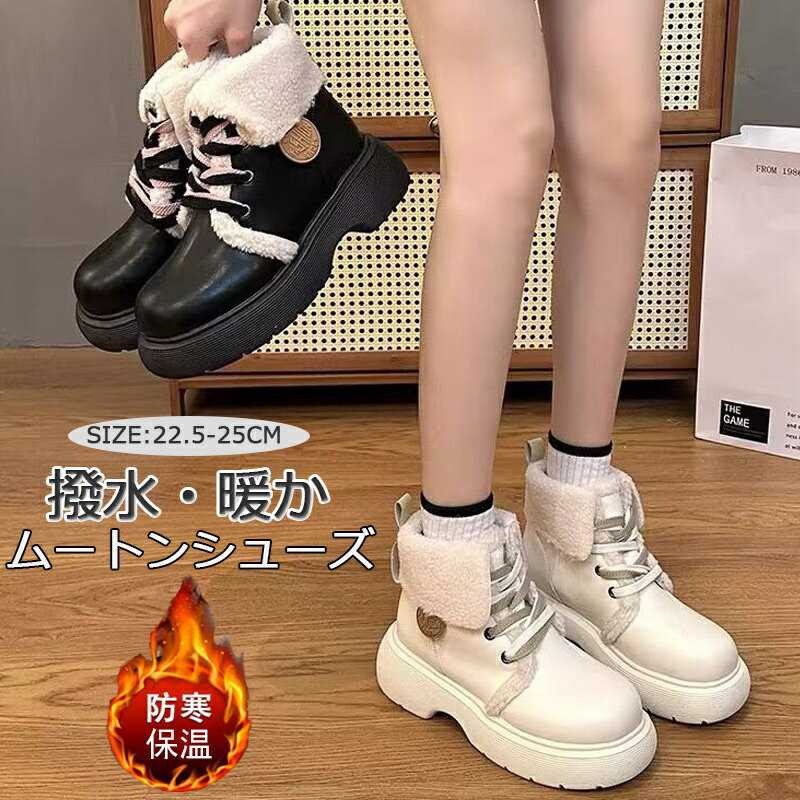 【新作登場!】ムートンブーツ シューズ 冬 靴 レディース ショートブーツ スノーブーツ 編み上げ レースアップ 裏起毛 PU ブーツ ペタンコ 厚底 プラットフォーム 裏ボア 防寒 保温 歩きやすい 履きやすい 撥水 滑り止め カジュアル風 暖か ラウンドトゥ お洒落
