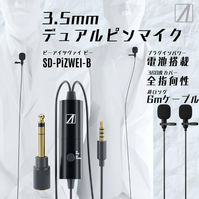 エアリア 3.5mm デュアルピンマイク ピンマイク 高性能 全指向性 マイク チャット 二股 プラグインパワーにも対応 電池 約6mの ロングケーブル 6.3mm変換プラグ付属 スマホ PC カメラ SD-PiZWEI-B