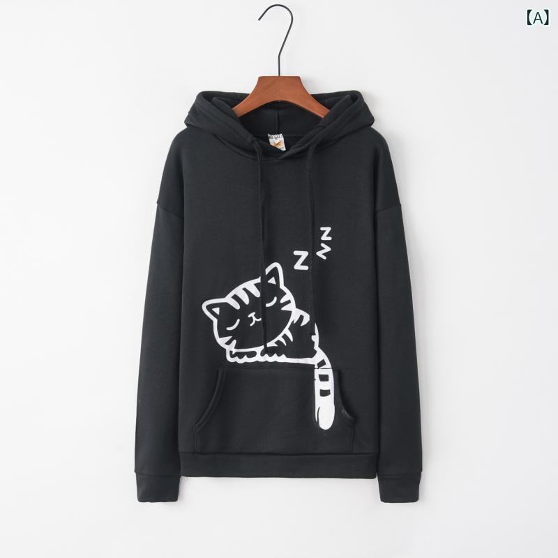 国境を 越えた 外国 貿易 eBay 春と 秋の ルーズフリースプリント 猫 パターンプリントフード 付き スウェットシャツ 婦人 服