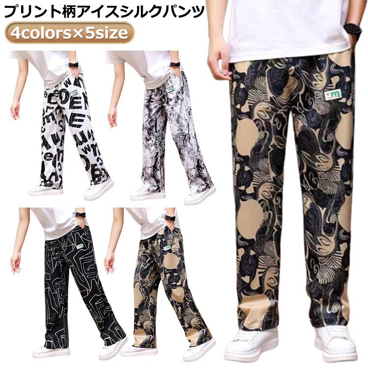 プリント柄アイスシルクパンツ メンズ ストレッチ アイスシルク カジュアルパンツ リラックスパンツ 冷感パンツ ストレッチパンツ 大きいサイズ ワイド涼感 春 夏 秋 薄手 アイスシルクロングパンツ ワイドパンツ