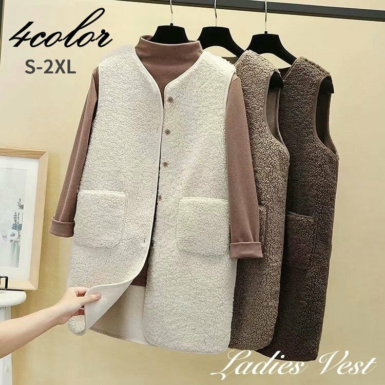 送料無料 ベスト ボアベスト レディース 女性 アウター 上着 羽織り 袖なし ロング丈 ボア 前ボタン ポケット モコモコ あったか 暖かい 無地 シンプル ソリッドカラー お洒落 お出かけ 普段使い 婦人用