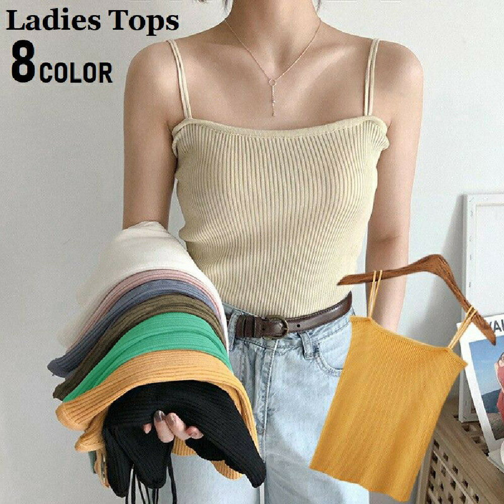 送料無料 キャミソール リブニット レディース トップス リブ編み 無地 シンプル ソリッドカラー 婦人服 ダブルストラップ 着回し 定番 サマーニット 外出 お出掛け 部屋着 ラフ 女性 フリーサイズ