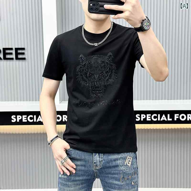 Tシャツ 夏 タイガーヘッド 刺繍 半袖 シャツ メンズ レディース兼 アメカジ トップス ゆったり ラインストーン アニマルプリント ラウンドネック