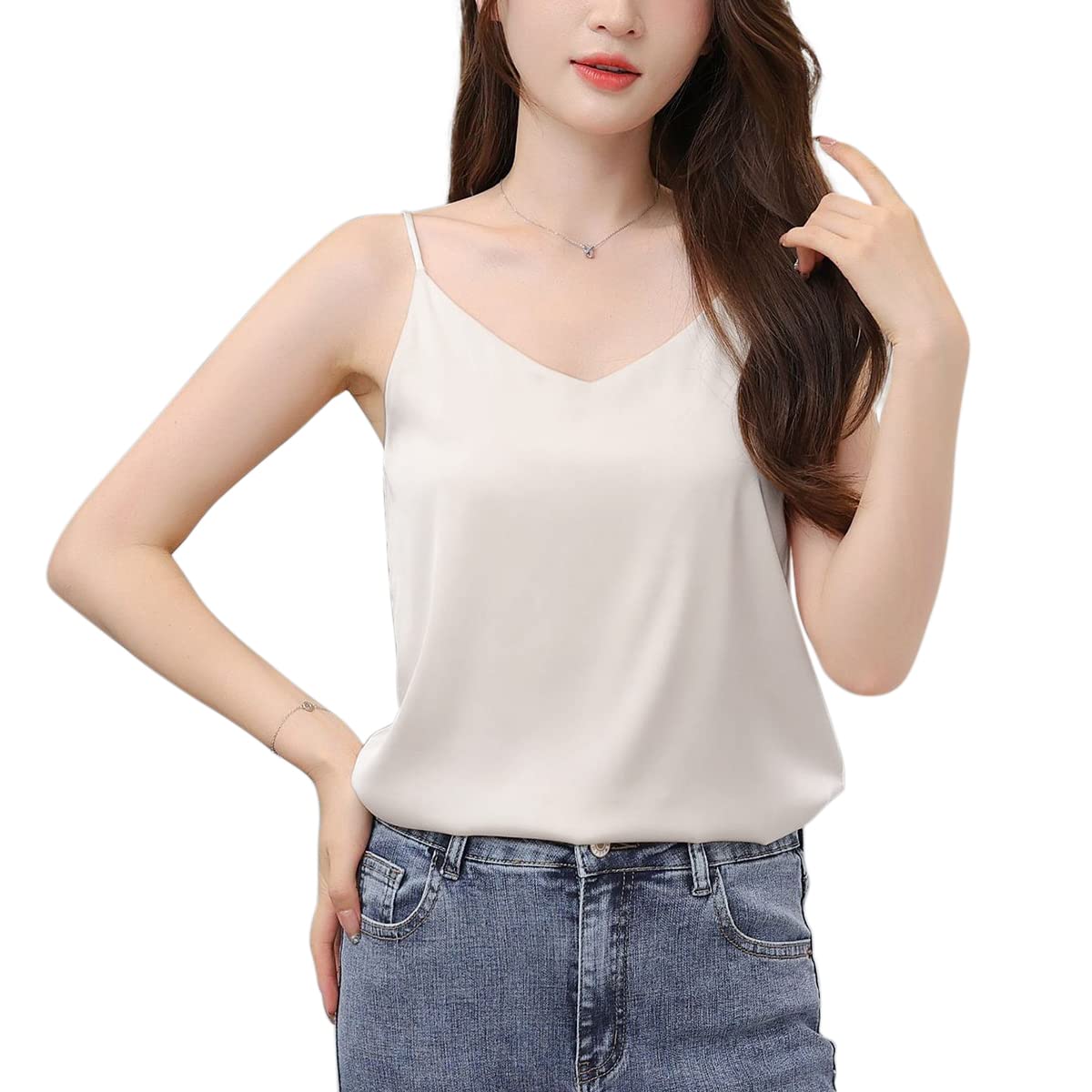 [Euyqs] シルク キャミソール Vネック シンプル サテンのベスト (ホワイト, XXL)