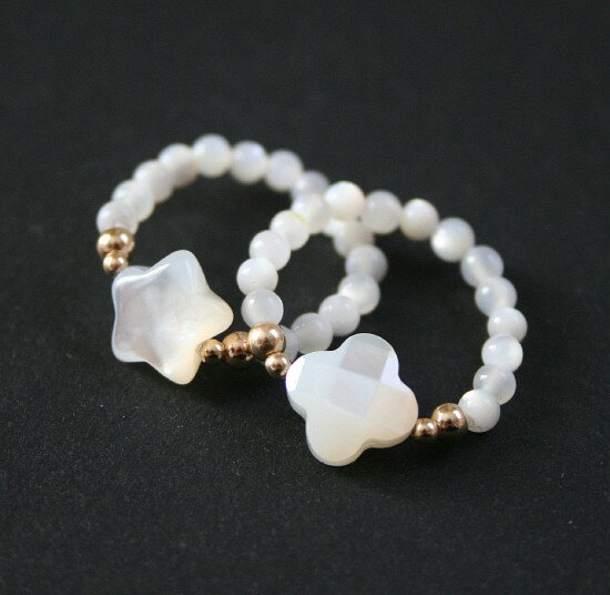 ホワイトシェル リング 指輪(スター フラワー)14KGF 天然石 アクセサリー ゴムリング ハンドメイド サイズ調整可 星 お花 フリーサイズ