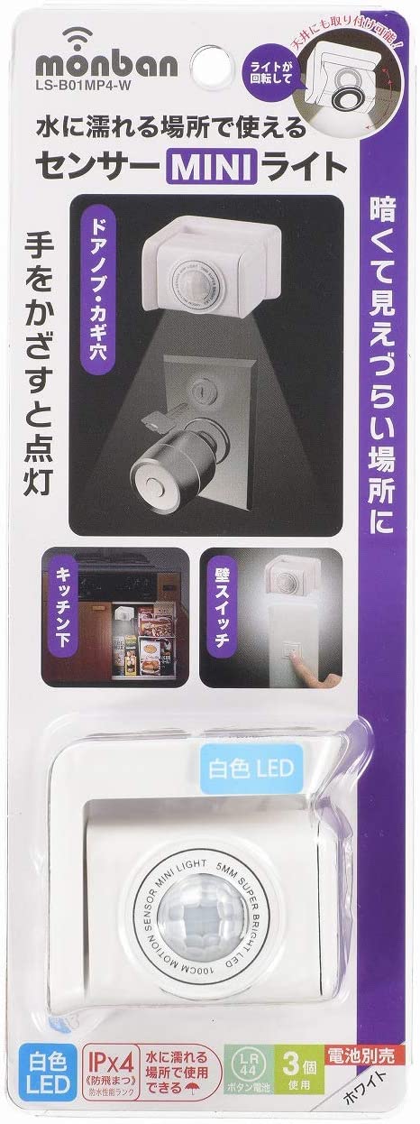 【送料無料】【新品】monban センサーミニライト 回転タイプ 白色LED ホワイト LS-B01MP4-W(1個)LR44ボタン電池3個使用(別売り)手をかざすと点灯