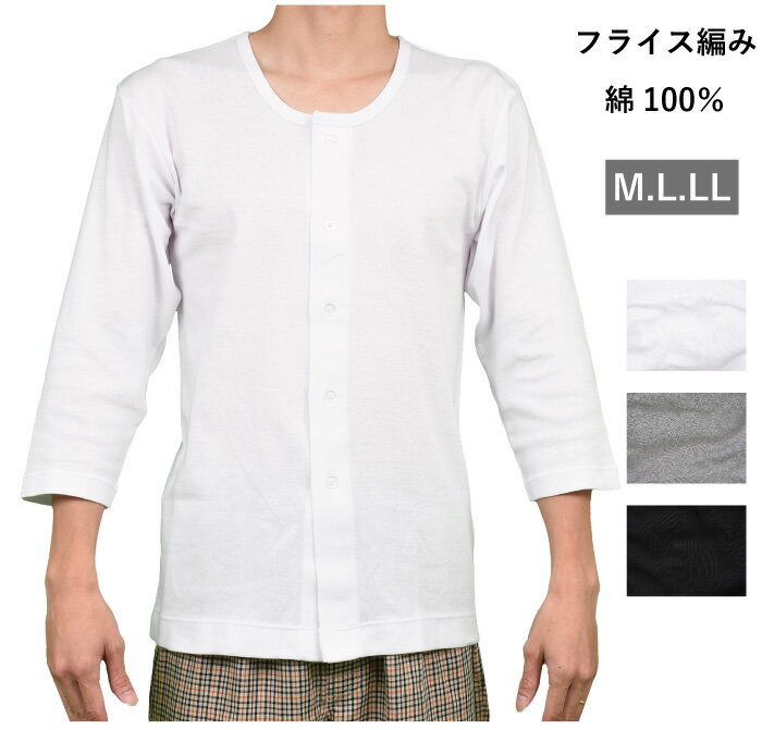 紳士インナー 七分袖ボタン付き全開丸首Tシャツ 7分袖丸首全開シャツ 長袖 M.L.LL 無地 白.グレー杢.黒【フライス編み】 ソフトな肌ざわり おしゃれ メンズ 紳士肌着 アンダーウェア インナーシャツ 1枚ならメール便選択可 中国製 メリヤスインナー