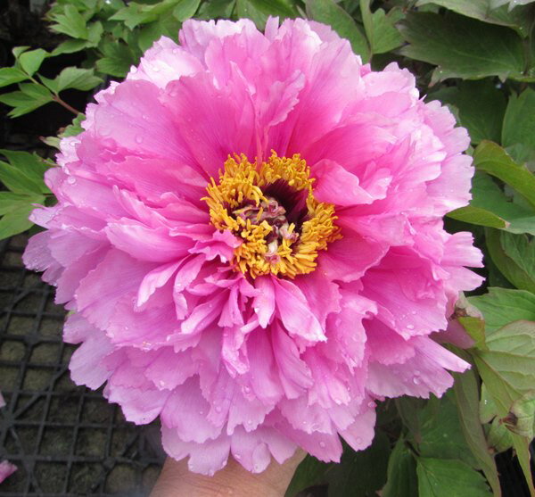※写真は見本品です。 2枚目の写真は25年4月23日に撮影しました。 3枚目の写真は11月に撮影しました。 木の状態は季節によって変化いたします 2311c-uボタン bt pi牡丹(ボタン) 越後獅子 (分類) ボタン科ボタン属の落葉中低木 (学名) Paeonia suffruticosa (原産)中国西北部 (開花期)4月下旬〜5月 (成木の樹高)1〜1.5m (栽培敵地)北海道〜九州 牡丹は中国の国花としても検討された花で、豪華な花の代表格的な花です。 古くから品種改良が盛んに行われ、園芸品種が多数作られてきました。 牡丹’越後獅子’は明るいピンク大輪種です。 牡丹の育て方 植え付け 日当たりがよく、水はけのよい肥沃な土壌を好みます。 自然界では種で増えるのですが、園芸的にはシャクヤクの根に接木して増殖されています。 従って苗を購入されたときは多くがシャクヤクの根が地上部に見えているものです。 2年くらいは芍薬の根が生きていますが、植える場合は芍薬の根が見えない程度に土をかけて植えつけ、ボタン自らの根が出やすくなるようにします。 根がしっかり出たら芍薬の根が腐るのが理想的です。 施肥 春に冬芽を成長させて延びきったら先にすぐに花を咲かせるものです。 冬〜早春までに十分な肥料を与えておきます。 また、鉢植えでは春の生育期には2回くらいの追肥を行い、肥料切れを起こさないようにします。 そして花後には種を作らせないように花柄をカットしておきます。 夏には休眠するので夏までの葉のある短い期間に十分肥培しておくことが翌年も花を咲かせる上で大切な仕事です。 夏に葉が枯れてきたらカットしてもよいでしょう。 植え替え 露地植えでは数年たつと土壌が硬く締まってしまうことがあります。 落ち葉や雑草に覆われていない土壌のむき出しになった場所でよく見られる現象です。 このようにならないようにするには土に腐葉土などを定期的に埋めてやったり、覆っておくことで防ぐことができます。 鉢植えでは根詰まりをおこして生育が悪くなるので毎年の植え替えが必要です。 植え替えは秋が最適ですが、冬〜春でも可能です。 用土は腐葉土や赤玉土を多用した水はけのよい用土を使用します。