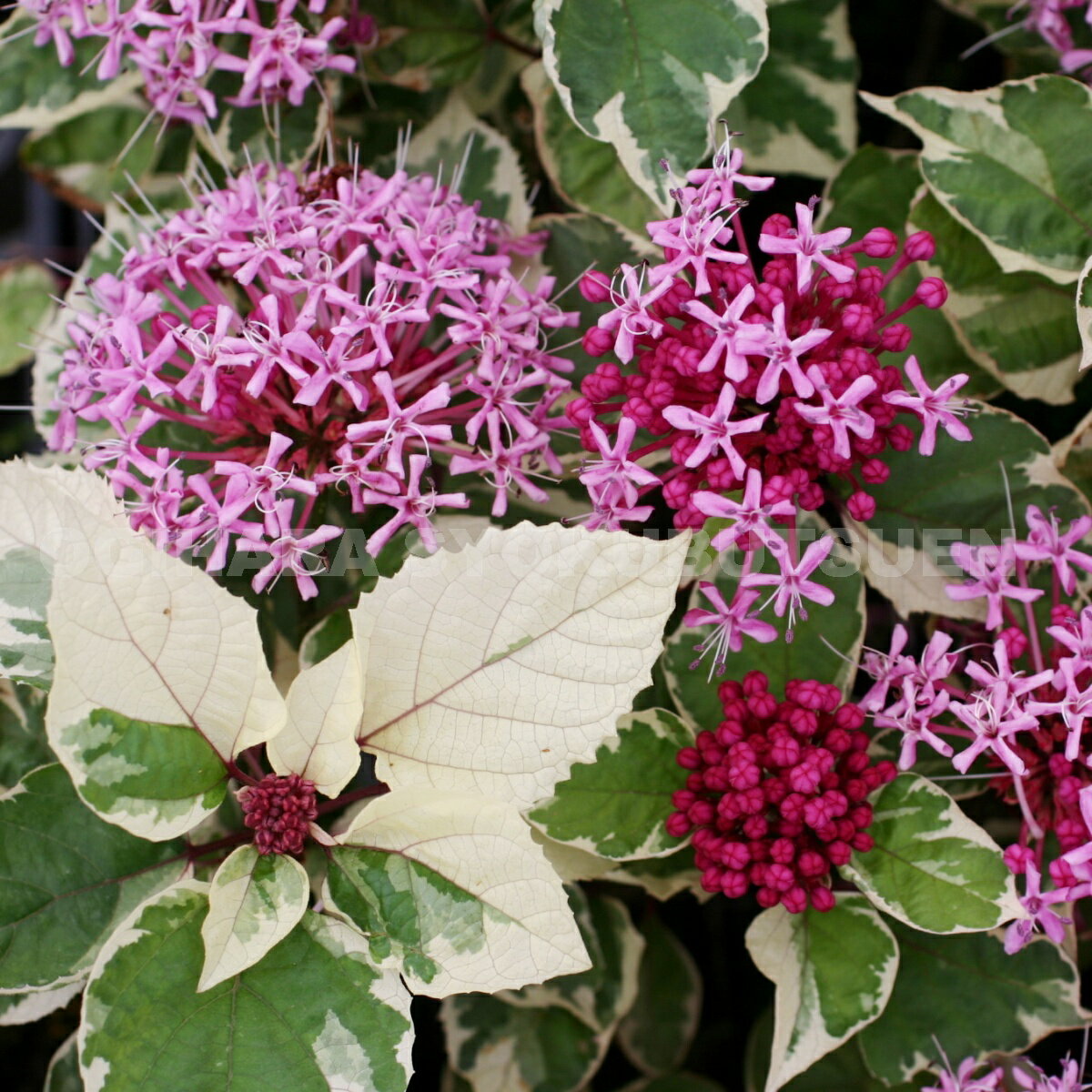 記事 ~2025年 11/12~ 気温が下がり、落葉が始まりました 庭植え、植え替えなど可能です ■ クマツヅラ(シソ)科 耐寒性低木(冬季落葉種) ■ 学 名 : Clerodendrum 'Pink Diamond' ■ 別 名 : クレロデンドルム、ヒマラヤクサギ、ベニバナクサギ、タマクサギなど ■ 花 期 : 夏 ■ 樹 高 : 60cm~1m前後(剪定により50cm前後にもできます) ■ 株張り : 80cm~1.5m前後(生育後の枝張り・環境差がある) ■ 耐寒性 : 普通(-5℃~-8℃ ※環境差がある) ■ 耐暑性 : 強い ■ 日 照 : 日向〜やや半日陰 ■ 用 途 : 庭木、生垣、大鉢仕立て ■ 原産地 : 中国(原種の主な自生地) ■ お届けの規格 12cmポット苗(高さ15〜30cm内外) ※季節により落葉中、剪定済みの場合があります 濃い色のツボミと淡いピンクの小花が集まり、15cmほどの大きな手毬状になる 葉色も花を引き立てる白とグレーの斑入りで、観賞価値が高く見ごたえがある花木 生育旺盛な強健種 〜担当スタッフのコメント〜 小花が密集して、アジサイのように大きな毬状の花をたくさん咲かせます。 大きくなる葉は、斑が入り、背が高く茂るのでカラーリーフとしても観賞価値が高く、長期間楽しめます。 性質は極めて丈夫で、地下の茎が伸びて株立ちになって広がります。あまりに広範囲にはならず、間引くことも難しくありませんから、場所の制限ができます。 簡単には枯れないので、初心者の方にもおすすめできる強さがあり、育てやすい植物です。 ボタンクサギとは、牡丹臭木と書きます。花は牡丹のように美しく、枝葉には独特の匂いがあるため、このような名前になったそうです。葉や枝の匂いは苦手な方がいらっしゃるかもしれませんが、剪定などの際、気になる程度で、切ったり擦ったりしなければ、普段から匂いが出ているわけではありません。尚、花は少し甘さのある良い香りがあります。 花つきがよく、枝の先端や脇枝から、たくさんの赤いツボミが出て、花火のようにピンクの花が次々に開花します。 少しエキゾチックな雰囲気もあり、遠目で見ても葉と花のコントラストが綺麗で、見栄えのする花です。 ↑ツボミの様子 ↑花つきも良いです ↑満開になると見事な手毬状になります ◆生育の様子と剪定方法 春になると、落葉した枝から葉が芽吹き、夏に向けてぐんぐんと大きくなります。 梅雨のころからツボミが出始めて、夏の暑い時期に良く開花します。 秋になっても葉はきれいで、冬になると紅葉し、落葉します。 株立ちになり、あまり高くなる木ではありませんので、あまり剪定は必要ありませんが、草丈を低く抑えたい場合は、花後に全体を切り戻す、または冬に枝を低めに切ります。落葉している枝の先端部にも花が咲きますので、すべての枝は切り戻さず、高い枝を低く切り、低い枝はなるべく残すように切ると良いです。 地下茎で広がった際に、斑の入らない緑葉の枝が出ることがあります。緑葉タイプも人気がありますが、斑入り葉のみを楽しみたい場合は、なるべく土中から切除してください。 特に土質は選ばず、半日陰でも花が咲くので、植え場所を選ばず、幅広く植栽していただけます。 ↑葉だけでも観賞価値があります 基本的な管理 日 照 寒冷地 日向〜やや半日陰 暖 地 日向〜やや半日陰 土 壌 肥沃 ■■■□□□ やせ地 ※平均的な土壌がよい 多湿 ■■■□□□ 乾燥地 ※平均的な水分がよい 耐乾性 普 通 耐えますが、常に乾く場所は避けます 耐湿性 普 通 ある程度耐えます 剪 定 花後、冬など 肥 料 春か秋が適期(ほぼ不要、生育が思わしくない場合のみ) 増 殖 挿し木 消 毒 目立った病害虫はありません お届けする苗について(当店は寒冷地です) 通年、栽培管理を行いながら販売しておりますので、お届けの季節により 苗の状態は様々です。おおよそ下記のとおりですのでご参照ください 春〜夏 芽吹き〜葉が茂る〜開花中 秋〜冬 紅葉中〜落葉の途中 冬〜春 落葉中〜切り戻し中 ※冬などは低温管理により葉がありません ↑苗の様子 冬頃(12cmポット 落葉中はさみしい見た目です) ↑苗の様子 初夏頃(12cmポット 葉がよく茂ります) ↑苗の様子 夏頃(12cmポット 7月頃 開花中) ※季節により姿は大きく変化しますので参考程度にご覧下さい