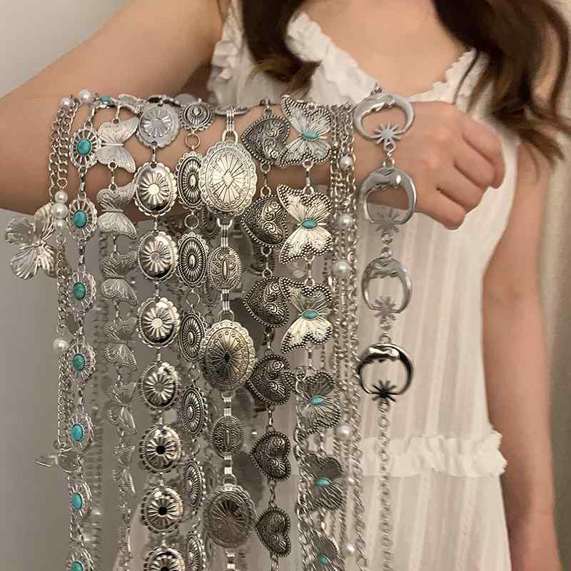 ベルト レディース おしゃれ シルバー 金属 ヴィンテージ風 ボヘミアン コーデ アクセサリー ウエストチェーン 装飾