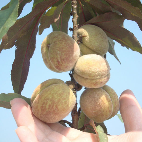 矮性桃(ドワーフピーチ)ボンファイヤー 規格:5号鉢植え 接ぎ木3年生苗 樹高:40センチ程度 矮性桃(ドワーフピーチ)ボンファイヤー:鉢栽培ができる矮性品種の桃です。 春には、見事な桃色の花弁に濃桃の目が入った花で木を覆います。 その後、美しい赤紫色をした長い葉が木を覆い、夏に向けてだんだんと、緑葉になっていき、実を付けます。 背丈が2m以下にしかならない矮性品種です。