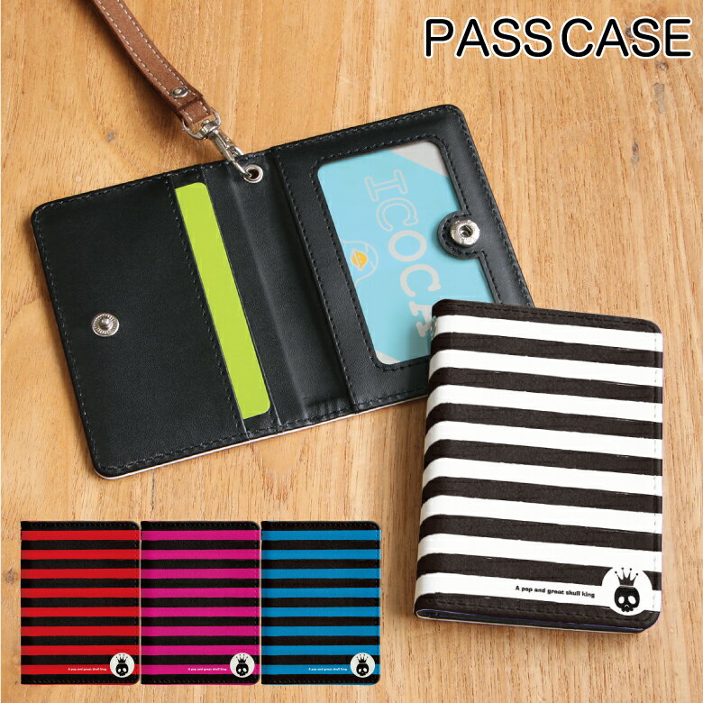 No60 PunkBorder パスケース ネックストラップ付き ICカードケース 通勤 通学 3ポケット ICOCA Suica icカード ケース パス 定期入れ 雑貨 社会人 学生 パンク ボーダー ドクロ スカル 赤 青 ストライプ ブラック レッド ブルー ピンク | カード入れ icカード入れ 二つ折り