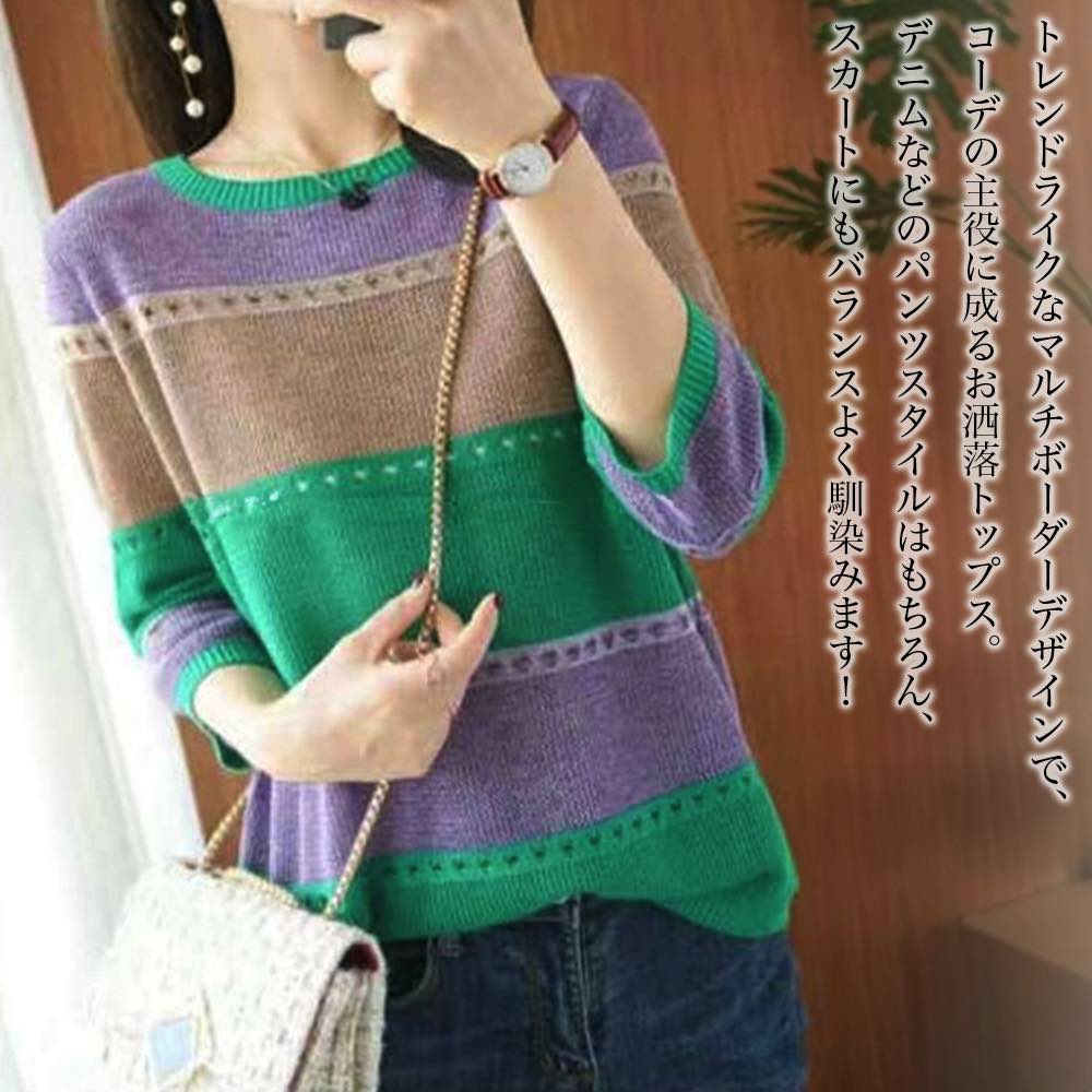 ボーダー ニットカットソー レディース カットソー プルオーバー ママ 婦人 トップス クルーネック ボートネック 半袖 五分袖 ゆったり メッシュ 軽い モード 普段着 シンプル 通勤 ストレッチ 伸縮性 秋 紫外線カット 遮光