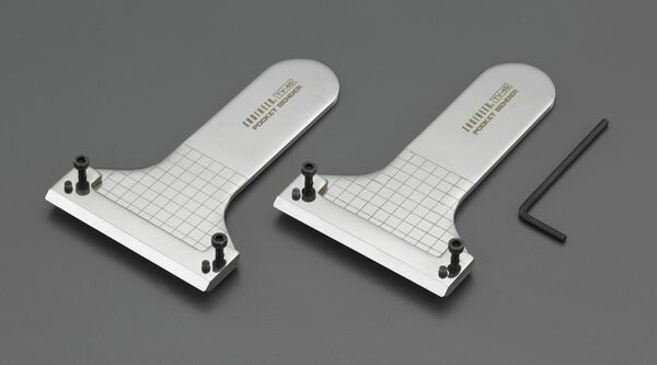 商品詳細サイズ商品説明 【特長】 ●2つのハンディタイプバイスにはさんで手で曲げるだけの簡単折り曲げ工具です。 ●設置場所も要らずどこでも手軽に作業する事が可能です。 ●工夫次第でコの字曲げから段曲げなど様々な加工が可能です。 ●折り曲げ時の金属の戻り値を考慮した角度設計で、約90度で曲げが可能です。 ※正確に90度で曲げたい場合は分度器等を使って調整してください。 ●水平曲げに便利な5mm方眼線付きで、ホビー・工作・モデル試作などにおすすめです。 【仕様】 ●ポケットベンダー ●硬度:HRC58±2 ●重量(g):256(1ペア) ●材質:ステンレス ●表面処理:鏡面研磨 ●鉄ネジ 六角2.5mm M3×8mm ●六角レンチ付属 ●曲げ能力: ・アルミ板 A5052:厚み1.5mm以下、幅30mm以下 ・純アルミ板 A1000系:厚み1.5mm以下、幅50mm以下 ・銅板・真鍮板:厚み1.0mm以下、幅50mm以下 ・アルミ棒:厚みφ3mm以下 ・銅・真鋳棒:厚みφ2mm以下 ●RoHS適合品 【ご注意】 ※A2000系等のアルミ合金の折り曲げには使用しないで下さい。ブレードやネジの損傷の恐れがあります。 ※適応外の厚みやサイズの金属板には絶対使用しないで下さい。本体やブレード、ネジの損傷原因になり、正常に曲げ加工出来なくなる恐れがあります。 ※素材を固定する際は、ブレードと本体が必ず平行になるよう調整し、固定して下さい。 ※ブレードが傾いているとブレードやネジが損傷する恐れがあります。送料について■送料 送料無料。但し、沖縄・離島を含む(一部配送不可地域)のご注文は配達不可のためキャンセルさせて頂きます。 画像はイメージです。カラー・サイズが異なる場合がございます。商品名・仕様をご確認ください。