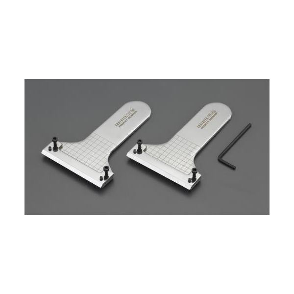 エスコメーカーお問い合わせ:06-6532-6226●材質…ステンレス●全長…117mm●曲げ能力…(アルミ板A5052):厚み1.5mm以下、幅30mm以下(純アルミ板A1000系):厚み1.5mm以下、幅50mm以下(銅板・真鍮板):厚み1.0mm以下、幅50mm以下(アルミ棒):φ3mm以下(銅・真鍮棒):φ2mm以下●アルミ板や銅板などをコの字曲げ・90°曲げ・段曲げ加工ができます。●水平曲げに便利な5mm方眼線付●入数…2個