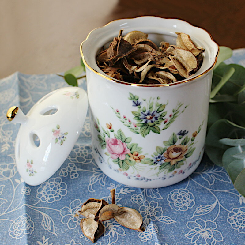 【アウトレット】白磁 ヴィクトリアン調 ローズ柄 ポプリポット (Φ11.8cm×h16.8cm) / ポプリジャー ポプリケース ポプリ容器 クラシックローズ ロココ調 イングリッシュガーデン柄 バラ柄 薔薇柄 小花柄 ハーブ柄 アロマポット アロマケース ポプリ入れ 小物入れ 美濃焼
