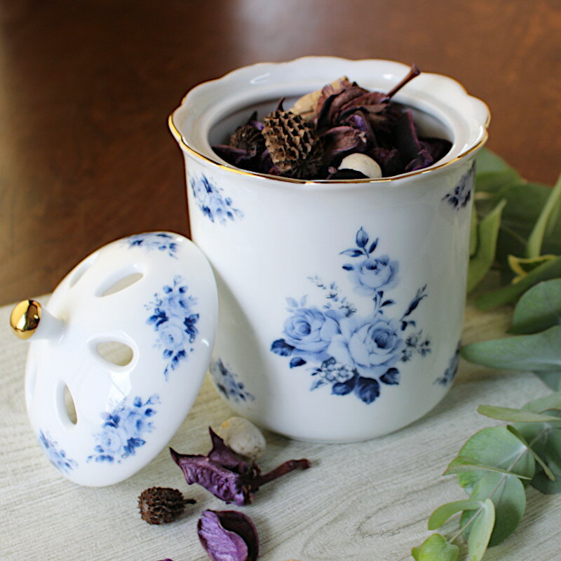 【アウトレット】白磁 ブルーローズ柄 ポプリポット (Φ12cm×h17.7cm) / ポプリジャー ポプリケース ポプリ容器 クラシックローズ 青いバラ 青い薔薇 蒼いバラ 蒼い薔薇 アロマポット アロマケース ポプリ入れ 小物入れ 美濃焼