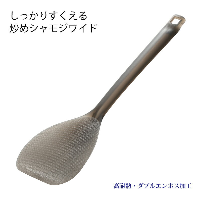フライパンに使える、ダブルエンボス加工のくっつかないシャモジ。 フチが薄く食材にすっと入るすくいやすい形状で返しやすい先端形状が特徴です。 置いてもへらの部分が浮くので衛生的です。 ◆製品仕様/食洗機OK ◆材質/ポリメチルペンテン(耐熱温度180℃・耐冷温度-30℃) ◆商品サイズ/9.2×31.6×1.6cm 38g ◆台紙サイズ/11.7×1.6×36.3cm 54g ◆日本製