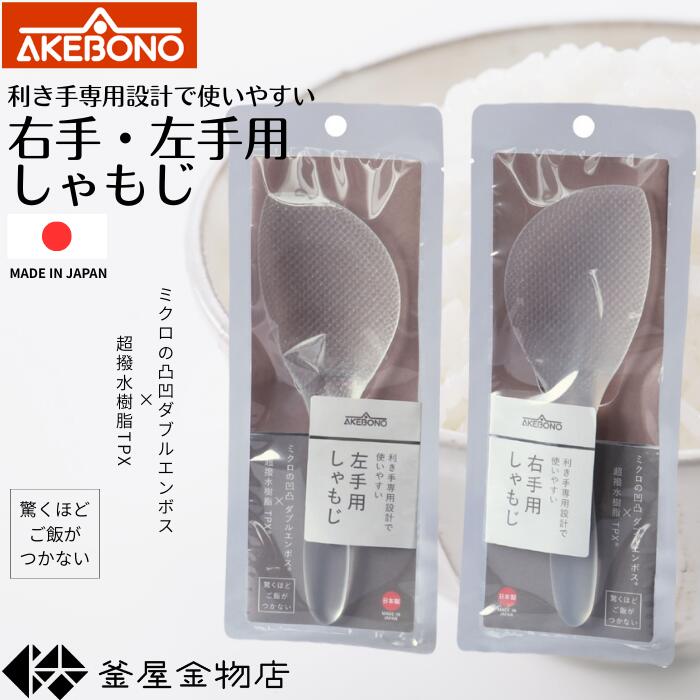 【しゃもじ】くっつかないしゃもじ 利き手専用 透明色 びっくりするほど、くっつかないしゃもじ【超おすすめ】 利き手専用設計で使いやすいしゃもじです。 大きなカーブ形状のヘラで、ご飯が切りやすく混ぜやすいが特徴! ミクロの凹凸「ダブルエンボス®加工」と、 超撥水「TPX®樹脂」の相乗効果で驚くほどご飯が付きません。 食器洗い乾燥機対応なのでお手入楽々♪ しゃもじの凹凸にご飯がこびりつかないのも嬉しいポイント! ストレスフリーのしゃもじを是非、体験してみて下さい。 ※お手入れについて 洗浄の際は、食器用洗剤、柔らかいスポンジをご使用ください。硬いスポンジやタワシなどを使用するとキズが付き、ご飯の付く原因になります。 しゃもじにご飯が付きやすくなったら、洗浄後にキッチン用漂白泡スプレーをかけ15~30分放置し、よく洗い流してください。そうすれば復活します。 商品詳細 ■材質:ポリメチルペンテン(耐熱温度180℃/耐冷温度−30℃) ■サイズ:67×17×206mm *注意【代引決済・後払い決済の場合は宅配便発送の為、ご注文金額によっては別途配送料を加算させていただきます。 その場合料金を訂正し御注文サンクスメールでお知らせしますので、必ずご確認ください。】このしゃもじ、やめられないよ~! 一家に一本必需品!