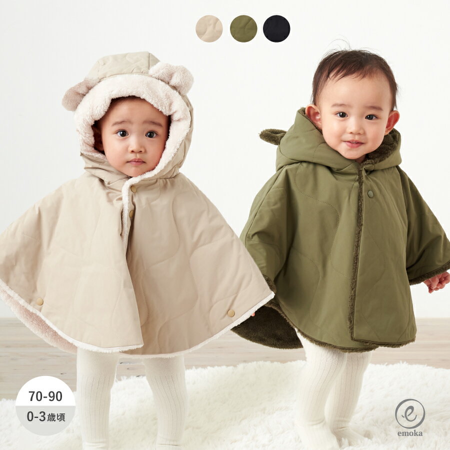 ベビー ポンチョ アウター コート 赤ちゃん 子ども 防寒 シンプル マント キルティング くまみみ 出産祝い ギフト プレゼント 静電気防止 裏ボア ふわふわ 兄弟 姉妹 お揃い あったか かわいい 男の子 女の子 emoka