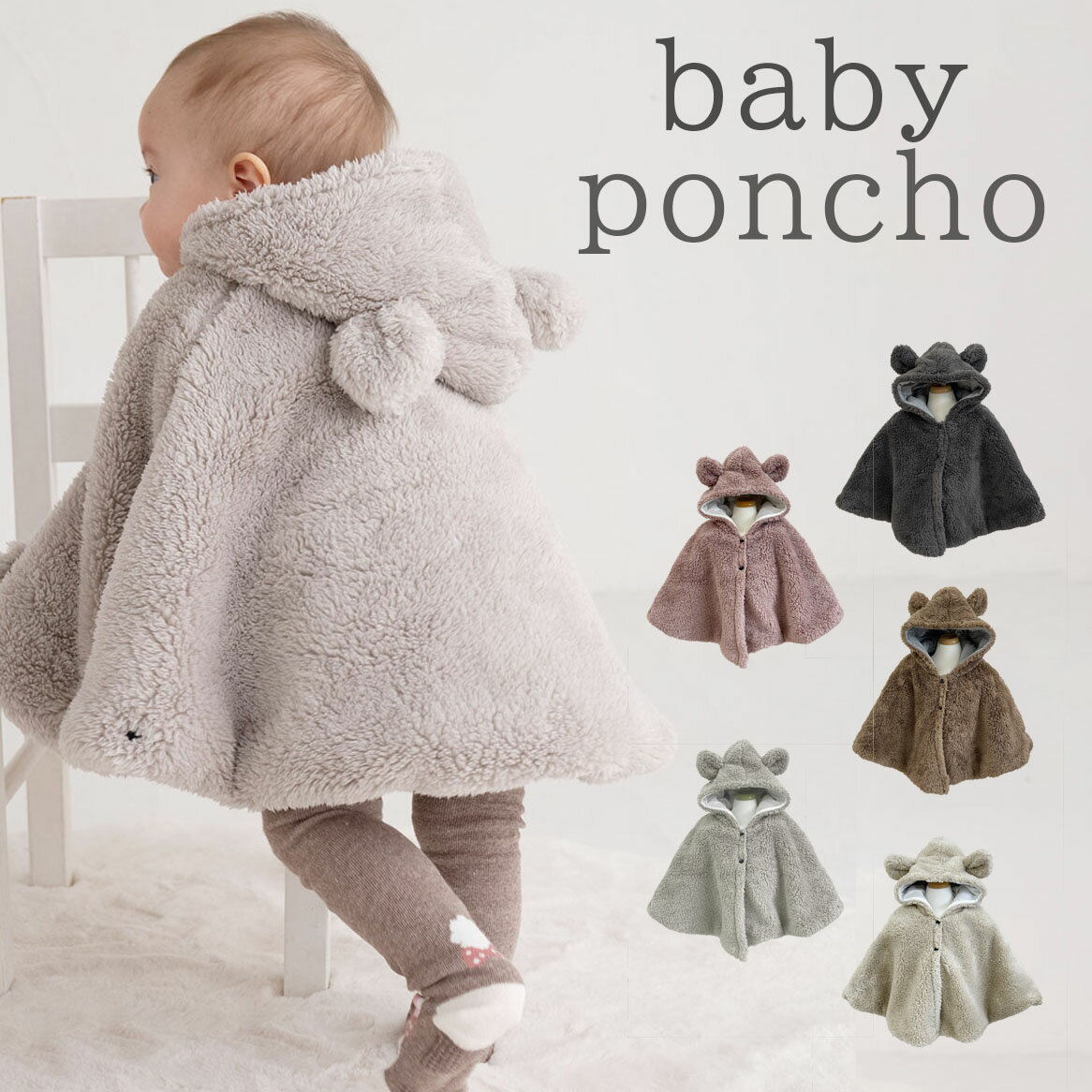 クマさんの耳がとても可愛くて暖かい♪ ベビー&キッズポンチョ。 肌触りの良いもこもこファー素材で、 袖はスナップボタンでパチンと留められます。 ●対象年齢:0歳〜2歳 ●カラー:サンド・モスピンク・モカ・ベージュ・チャコール・コーラルピンク ●素材:ポリエステル100% ◆製造:中国製 ※ご注意 返品・キャンセルは出来ませんのでご了承下さい。 (万が一、不良品の場合はご連絡お願い致します)