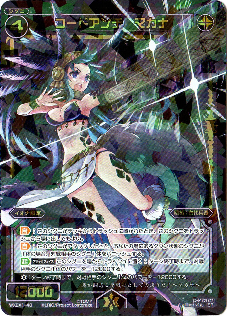WXEX01-48 コードアンチ マカナ<コードアンチマカナ> SR コードアンチ マカナ Illust れん カード種類シグニカードタイプ精械:古代兵器 色黒レベル4 グロウコスト-コスト- リミット-パワー12000 限定条件イオナ限定ガード- 対応フォーマット 【自】:このシグニがデッキからトラッシュに置かれたとき、このシグニをトラッシュから場に出してもよい。 【自】:このシグニがアタックしたとき、あなたの場にあるダウン状態のシグニが1体の場合、対戦相手のシグニ1体をバニッシュする。 【起】《アタックフェイズアイコン》このシグニを場からトラッシュに置く:ターン終了時まで、対戦相手のシグニ1体のパワーを−12000する。 ライフバースト:ターン終了時まで、対戦相手のシグニ1体のパワーを−12000する。 我が闘志こそ戦士としての誇りだ!〜マカナ〜[WXEX-01]アンリミテッドセレクター