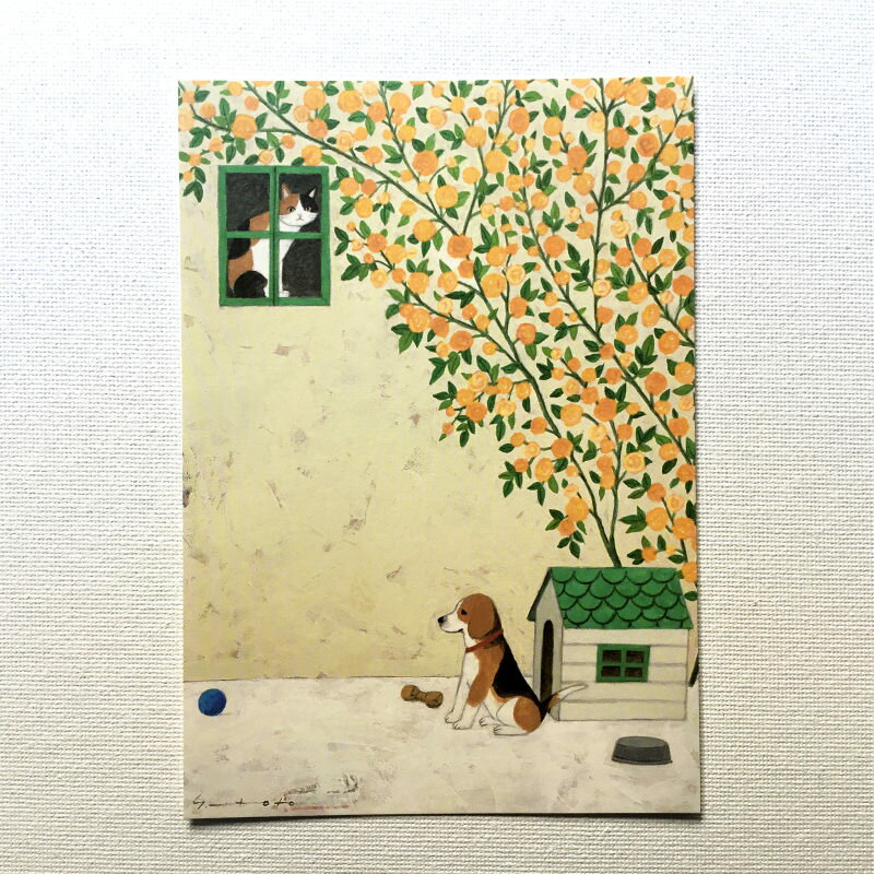 Yoko Matsumoto マツモトヨーコ ポストカード 黄色い花 ビーグル 三毛猫